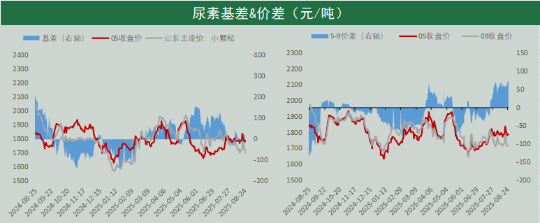 上周,尿素期货跌幅弱于现货跌幅,基差走弱。以山东地区为基准,截至8月25日,01合约基差-35元/吨,周度-21元/吨。截至8月25日,1-5价差-44元/吨,周度-7元/吨。