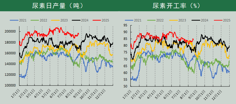 下个周期预计4家企业计划停车,1家停车企业恢复生产,预期下个周期产量减少的概率较大。根据肥易通数据,2025年8月18日,全国尿素日产量19.47万吨,开工率82.55%。
