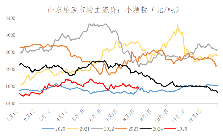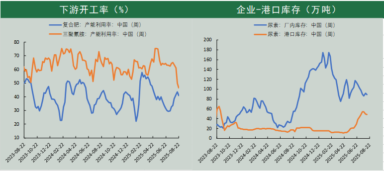 库存数据来看,截至2025年8月22日,中国尿素企业总库存量102.39万吨,较上周累库6.65万吨,环比增加6.65%,同比偏高56.33万吨。内需不足,产量又增加,库存表现为增加,且目前位于近五年高位,大量库存压制行情上涨空间。港口样本库存量48.3万吨,较上周-1万吨,出口货源陆续离港,港口库存表现为去化。
