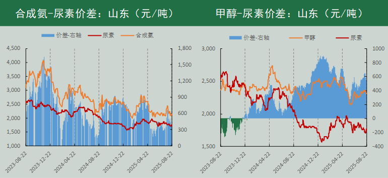 上周,合成氨价格重心下移,截止到8月22日,山东地区合成氨价格2105元/吨,周度-75元/吨;尿素现货价格上周上涨;山东地区合成氨尿素价差540元/吨,周度走弱216元/吨。上周,甲醇现货价上涨,截止到8月22日,甲醇报价2365元/吨,甲醇与尿素价差605元/吨,周度走强10元/吨。
