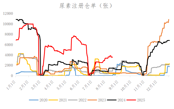 2025年8月25日,尿素仓单数量5123张,周环比+1550张。